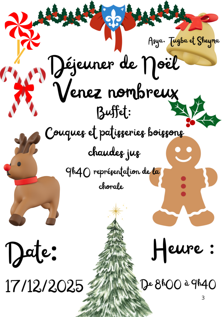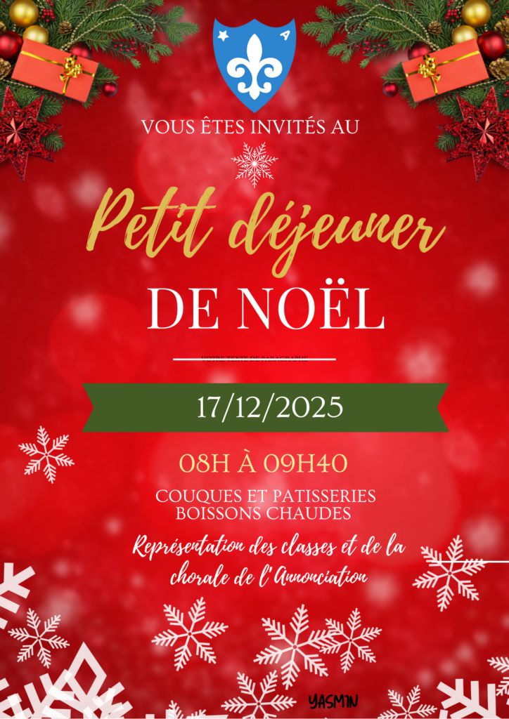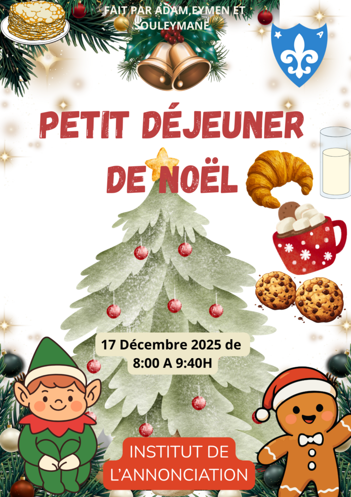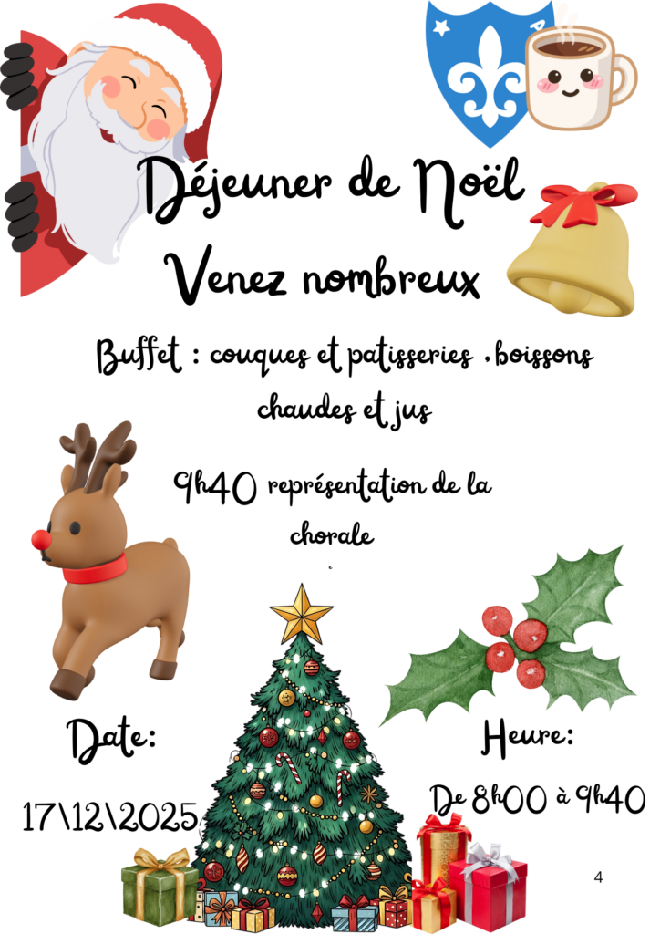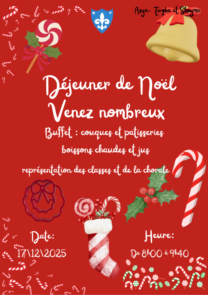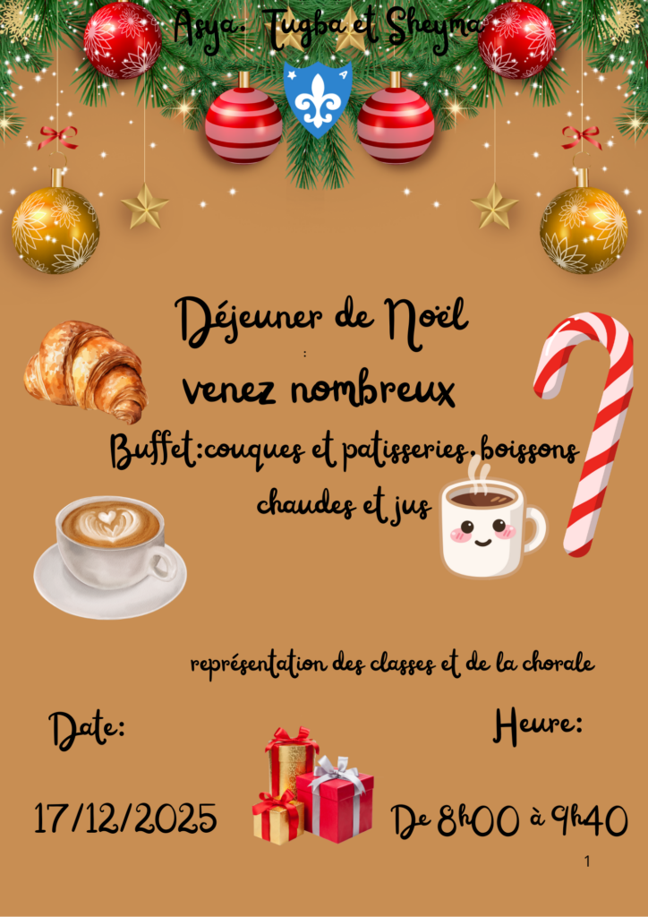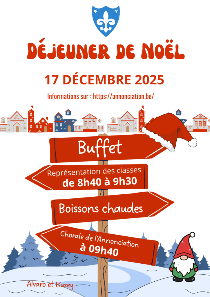 Ce mercredi 17 décembre, notre école vibrera au rythme de la fête lors d’un merveilleux Déjeuner de Noël où enfants et parents sont chaleureusement conviés 🥰. Au programme : représentations des classes, boissons chaudes bien réconfortantes ☕, chorale à 09h40 🎶, couques, pâtisseries gourmandes… bref, une matinée magique à partager ensemble !